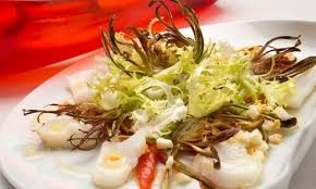 ENSALADA DE BACALAO Y MORRONES CON CHIPS DE ALCACHOFAS.